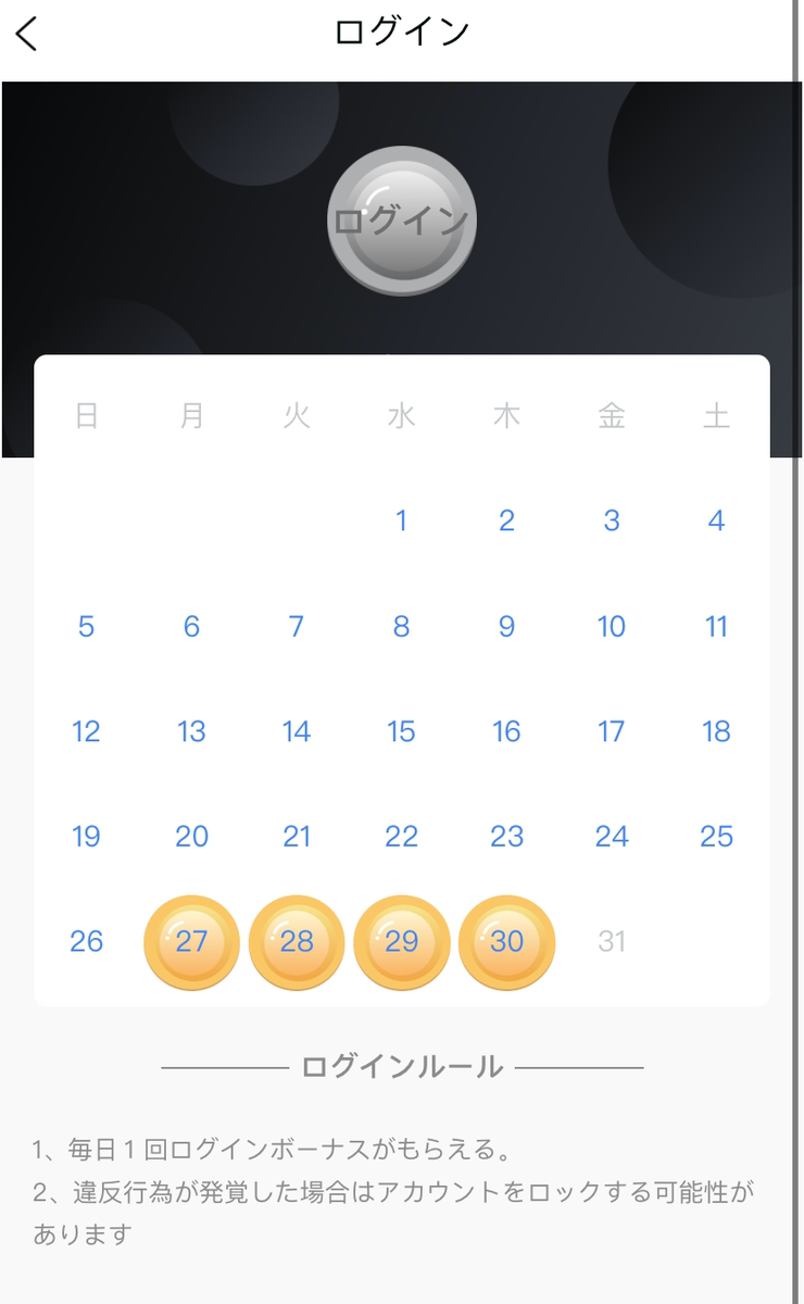 こちらはアプリを起動するだけではなく、「マイページ」から「毎日ログイン」を選択、上の「ログイン」をタップでログイン完了です。